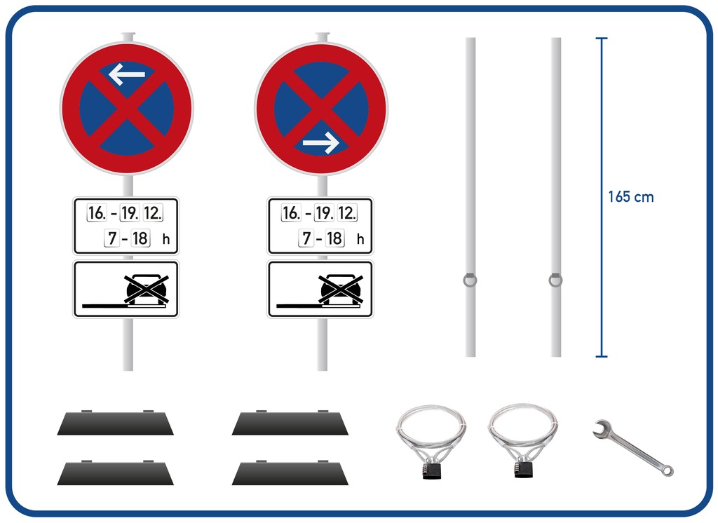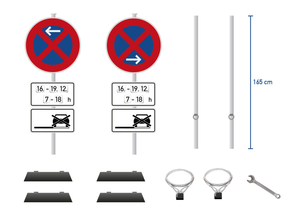 Dazu gehören: 2 Schilder (für Anfang und Ende), 4 Zusatzzeichen (2x Datum, Uhrzeit und 2x Halteverbot auf dem Seitenstreifen), individuelle, rechtssichere DIN-Beschriftung, 4 Fußplatten sowie eine Diebstahlsicherung pro Schild.